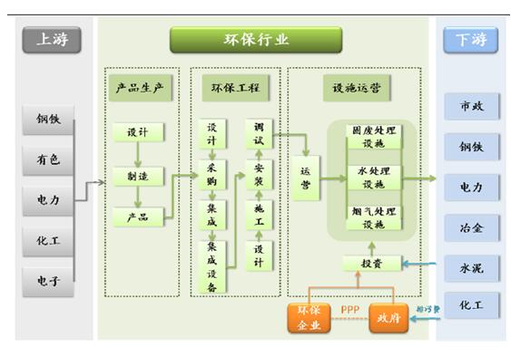 環(huán)保行業(yè)產業(yè)鏈可分為廣義和狹義兩種。廣義上的環(huán)保行業(yè)產業(yè)鏈,其上游主要是鋼鐵、有色、電力、化工、電子元器件等行業(yè)。下游用戶則主要包括市政以及鋼鐵、電力、水泥、冶金、化工等工業(yè)行業(yè)。環(huán)保產業(yè)鏈一個相對突出的特點是,上、下游行業(yè)存在一定的重疊,即環(huán)保行業(yè)的需求方同時也是供給方,如鋼鐵、電力、化工等行業(yè)。狹義的環(huán)保行業(yè)產業(yè)鏈,即從環(huán)保行業(yè)本身看,可以大致劃分為:上游環(huán)保產品生產,中游環(huán)保工程,以及下游環(huán)保運營。