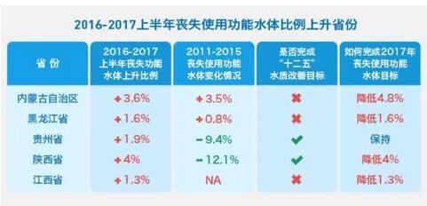 據(jù)通報(bào),內(nèi)蒙古`、黑龍江、江西、貴州、陜西5省喪失使用功能水體均有所上升。