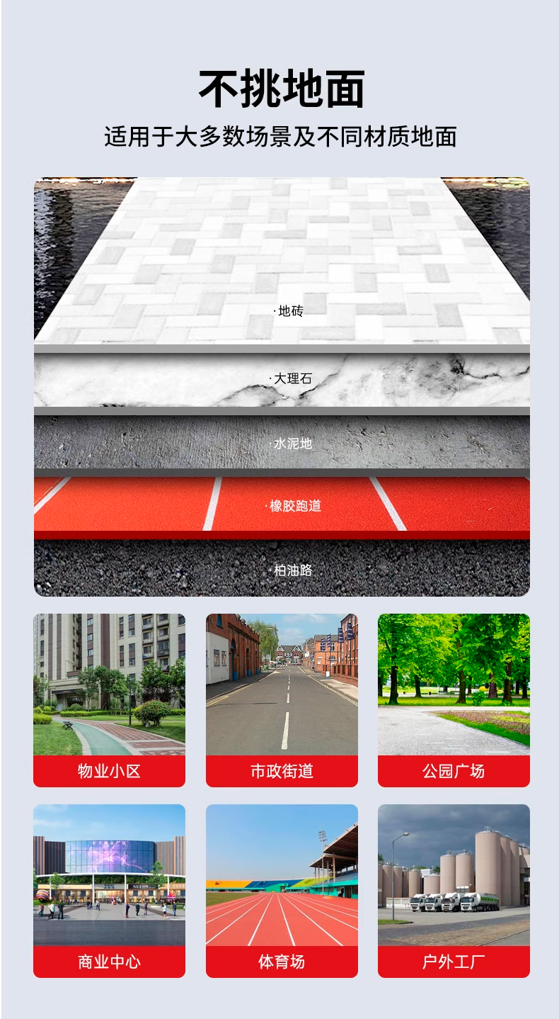 適用場所:吸塵、掃地、噴水相結合的自動清潔一體機,主要用于飛機場、公園、環(huán)衛(wèi)、廠區(qū)、游樂園、廣場、高校、保潔公司、物業(yè)管理公司等的室外清掃。